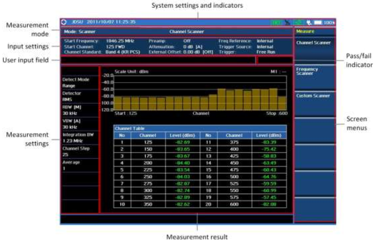 Measuring and determining power level of chanels with different frequencies and different mobile technologies.